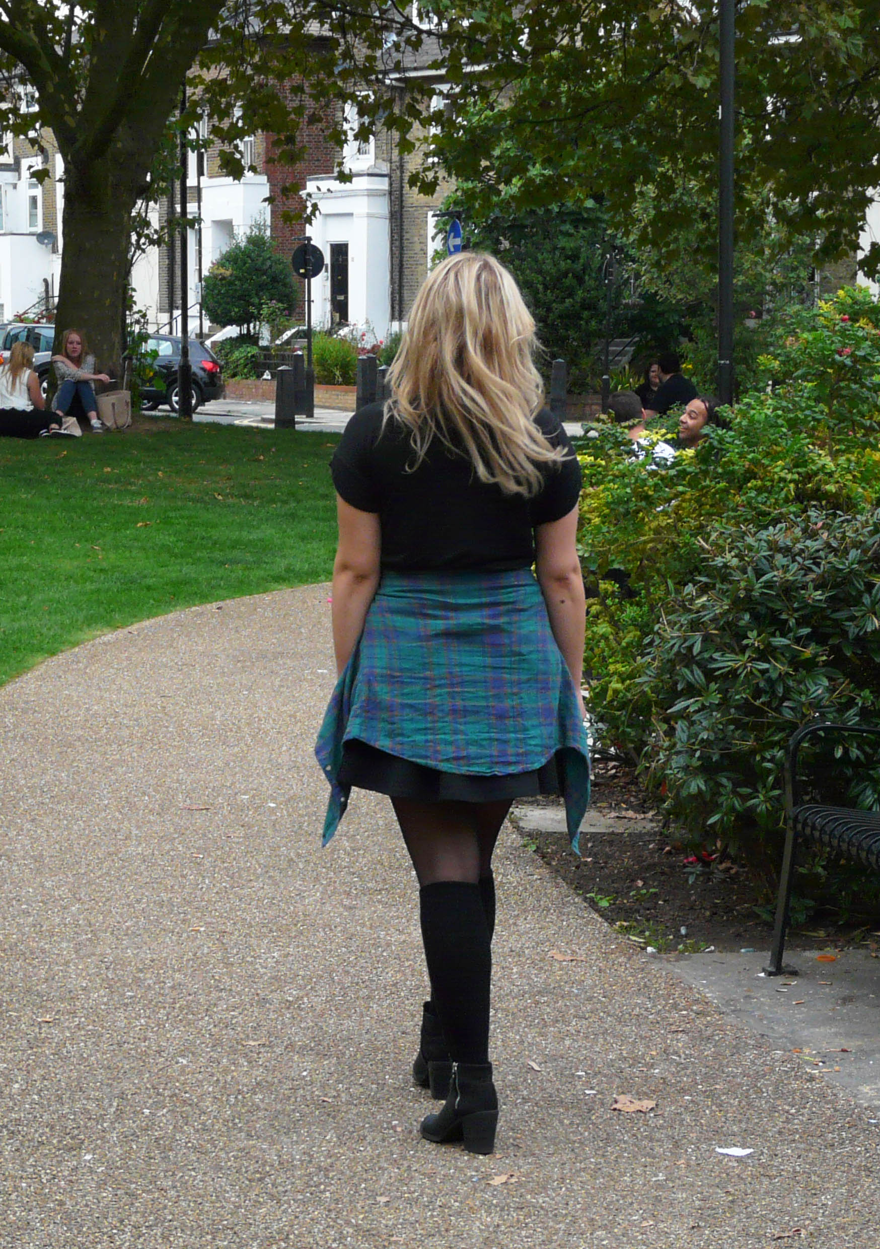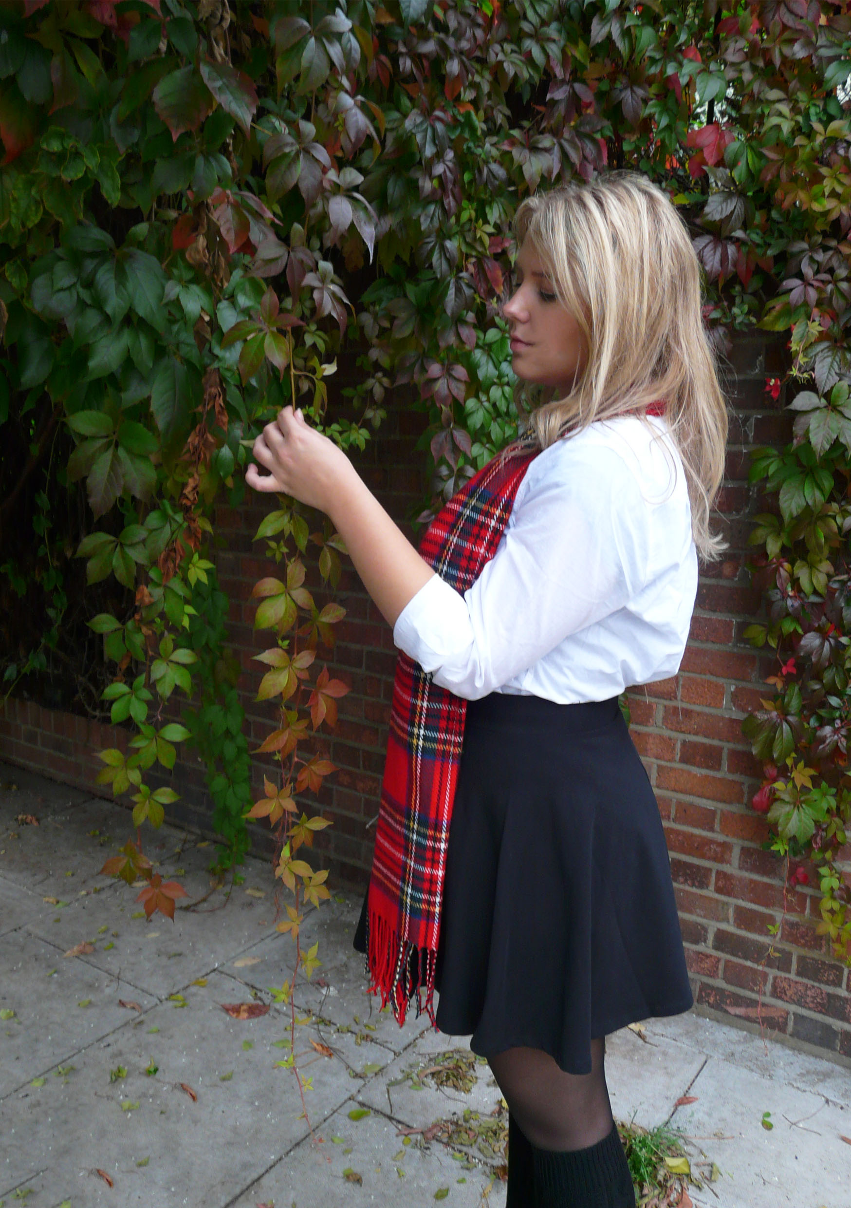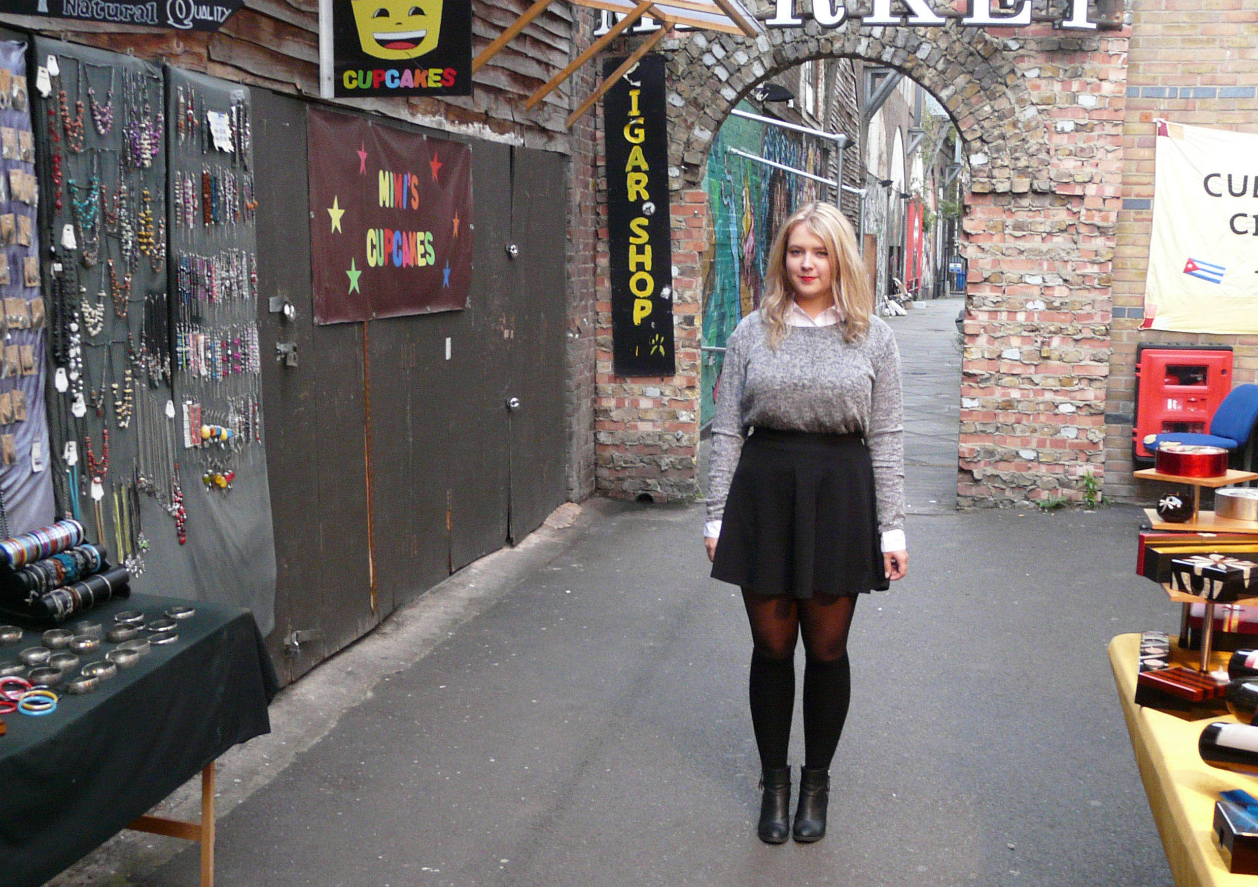 De eerste outfit is geïnspireerd op het traditionele schooluniform in Engeland. Ik vind het een leuke combinatie van meisjesachtig maar toch stoer. De blouse die ik draag komt van de H&M, net zoals het rokje, panty en de schoenen. De trui heb ik op de ‘Camden Lock Market’ gekocht.
